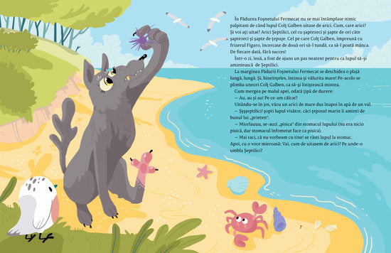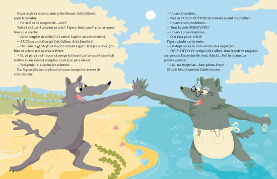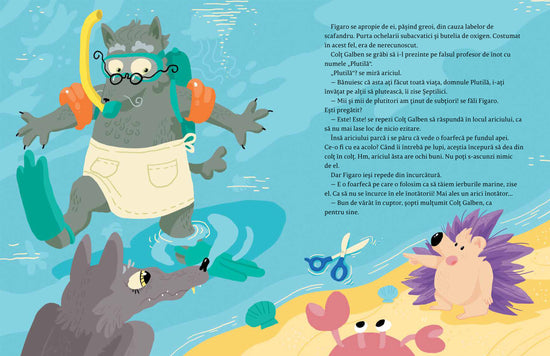 Ce face foamea din lup! Colț Galben își amintește de ariciul Șeptilici când îi e stomacul mai gol și miorlăie ca o pisică. Prietenul lui, lupul Figaro, tocmai și-a deschis o frizerie subacvatică, unde clienții plutesc cu burta la soare și nici nu simt când sunt tunși pe spinare pe sub apă. Aha! îi vine lui Colț Galben o idee.