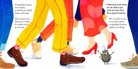 Un gândăcel mititel se plimbă așteptând să-l vadă și pe el oamenii. Dar e prea mic, nimeni nu-l bagă în seamă. Până când află un secret important de la alte făpturi micuțe — sau un pic mai mari decât el. O poveste în versuri jucăușă, dovadă minunată pentru cei mici că sunt văzuți de părinți.