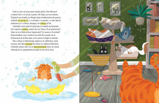 Într-o librărie minunată locuiesc cinci pisici de care librarul are grijă. Sunt foarte fericite acolo,