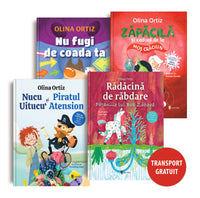 Patru cărți amuzante ale Olinei Ortiz, completate de idei de activități de Oana Moraru: prima, din care copiii vor afla ce înseamnă răbdarea printr-o călătorie în lumea micilor viețuitoare; a doua este povestea unui băiețel uituc căruia îi vine în ajutor piratul Atension; o alta ne arată un cățel fugind de propria-i coadă. Și, firește, pentru că vin sărbătorile de iarnă, o carte despre Moș Crăciun și ajutoarele lui, oița Flecărica și spiridușul Zăpăcilă.