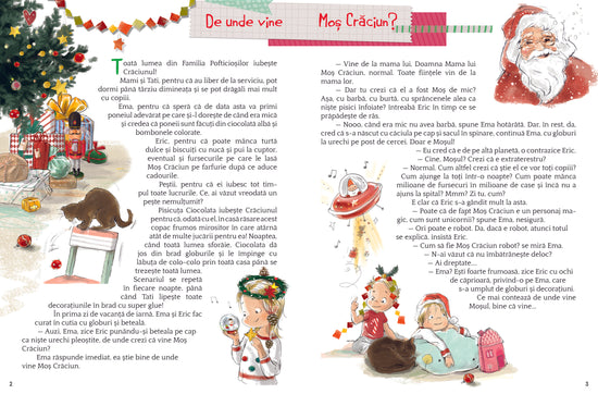 Ema și Eric îți spun ce cadouri pregătesc pentru mami și tati, care sunt cărțile și filmele preferate de Crăciun, te învață cum să faci celebra turtă dulce și îți arată cum împodobesc bradul. De asemenea, cei doi Pofticioși te invită să colorezi alături de ei, să o ajuți pe Ema să ajungă la cadoul de Crăciun sau pe Eric să ajungă la turta dulce. Și câte și mai câte. Le vei descoperi parcurgând această carte minunată.