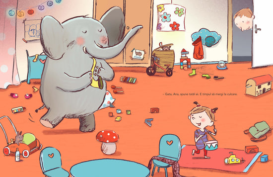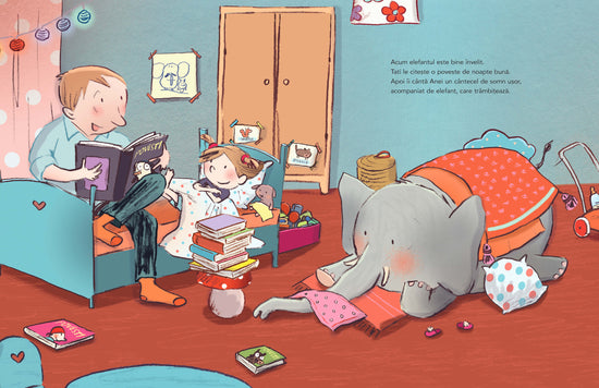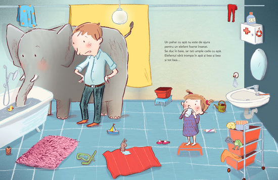 Pentru Ana şi elefantul ei preferat, a venit ora de culcare! La fel ca Ana, elefantul trebuie să bea apă, să se spele pe dinţi, să meargă la toaletă… Tati va înţelege imediat că nu e atât de uşor să faci un elefant să adoarmă, fiindcă pentru Ana elefantul ei nu e unul de pluş, ci este cât se poate de adevărat! Dacă elefantului îi este sete, va bea o cadă de apă! Iar periuţa de dinţi e prea mică pentru colţii lui uriaşi,trebuie folosită o perie de podele! Şi oare ce se va întâmpla dacă elefantul vrea să meargă la toaletă?